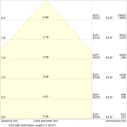 De gradenbundel geeft informatie over hoe breed het licht wordt uitgestraald. Dit zit tussen de 0 en 360 graden (D). Hoe kleiner de hoek, hoe specifieker de lichtbundel is. Over het algemeen is een smalle gradenbundel perfect voor sfeer- of accentverlichting, terwijl een brede gradenbundel ideaal is om grote oppervlaktes te verlichten.