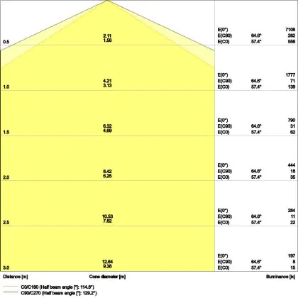 De gradenbundel geeft informatie over hoe breed het licht wordt uitgestraald. Dit zit tussen de 0 en 360 graden (D). Hoe kleiner de hoek, hoe specifieker de lichtbundel is. Over het algemeen is een smalle gradenbundel perfect voor sfeer- of accentverlichting, terwijl een brede gradenbundel ideaal is om grote oppervlaktes te verlichten.