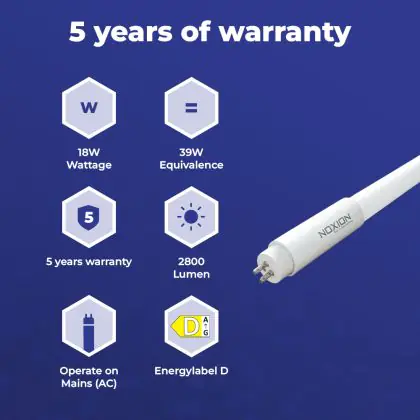 Met een wattage van 18W is de T5 LED TL buis van Noxion gemiddeld 50% zuiniger als een TL-5 buis van 39W. Naast deze vermindering van jouw energieverbruik, dalen ook jouw kosten voor onderhoud en vervanging. De lichtbron gaat immers twee keer zo lang mee met de gemiddelde levensduur van 50000 branduren. Er is echter een mogelijkheid om nog duurzamer te gaan verlichten, namelijk door via deze link een dimbare LED montagebalk aan te schaffen.