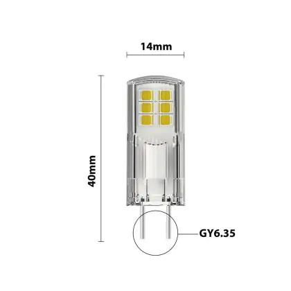 Deze GY6.35 LED lamp heeft een diameter van 14mm en is 40mm lang. Deze afmetingen zijn belangrijk om te weten, omdat GY6.35 LED steeklampjes doorgaans iets groter kunnen zijn dan conventionele GY6.35 halogeenspots. Door de afmetingen van deze GY6.35 LED lamp te vergelijken met je huidige lamp voorkom je dat je een nieuwe lamp koopt die niet in het betreffende armatuur past. Wel zo prettig is dat je bij de aankoop van dit product een Lampdirect All-in garantie krijgt van 2 jaar.