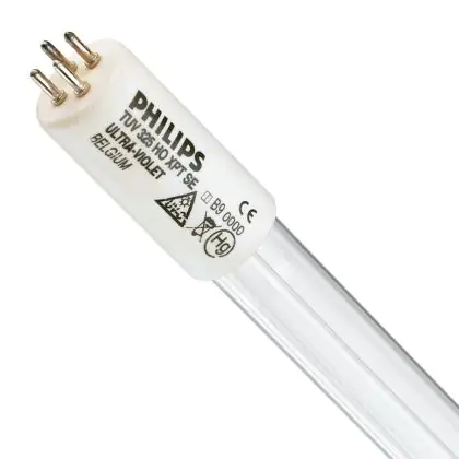 "GEVAAR: Risico Groep 3 - Ultraviolet product. Deze producten zijn bedoeld voor disinfectie en kunnen niet voor algemene verlichting gebruikt worden. De producten produceren hoog vermogen UV-C licht, dat ernstig letsel aan de huid en ogen kan veroorzaken. Vermijd blootstelling aan ogen en huid. Alleen gebruiken in een afgesloten omgeving die gebruikers beschermt tegen het UV-C licht. In het geval van breken van een lamp volg deze voorschriften: ventileer de kamer 30 minuten en verwijder daarna de losse onderdelen. Gebruik hierbij handschoenen. Leg de losse onderdelen in een afgesloten verpakking (plastic zak) en breng het naar uw plaatselijke milieustraat als chemisch afval. Gebruik geen stofzuiger."